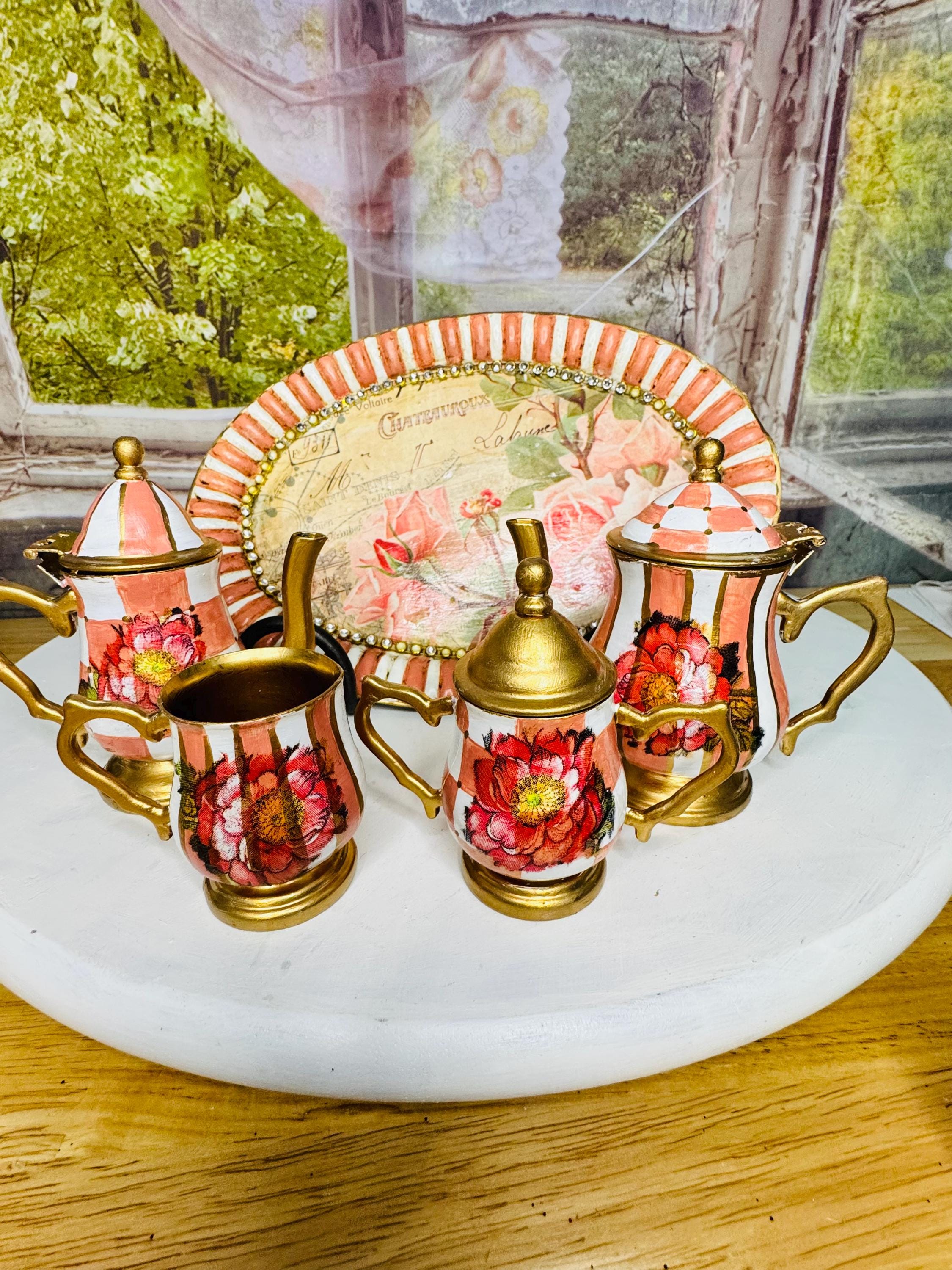 This hand painted metal/silver it’s so adorable. The tray is 10” long x 7” wide. Decoupaged and sealed. There are two teapots 4 1/2” tall, 2” creamer, 3 1/2” sugar with lid, All have a floral decal sealed.