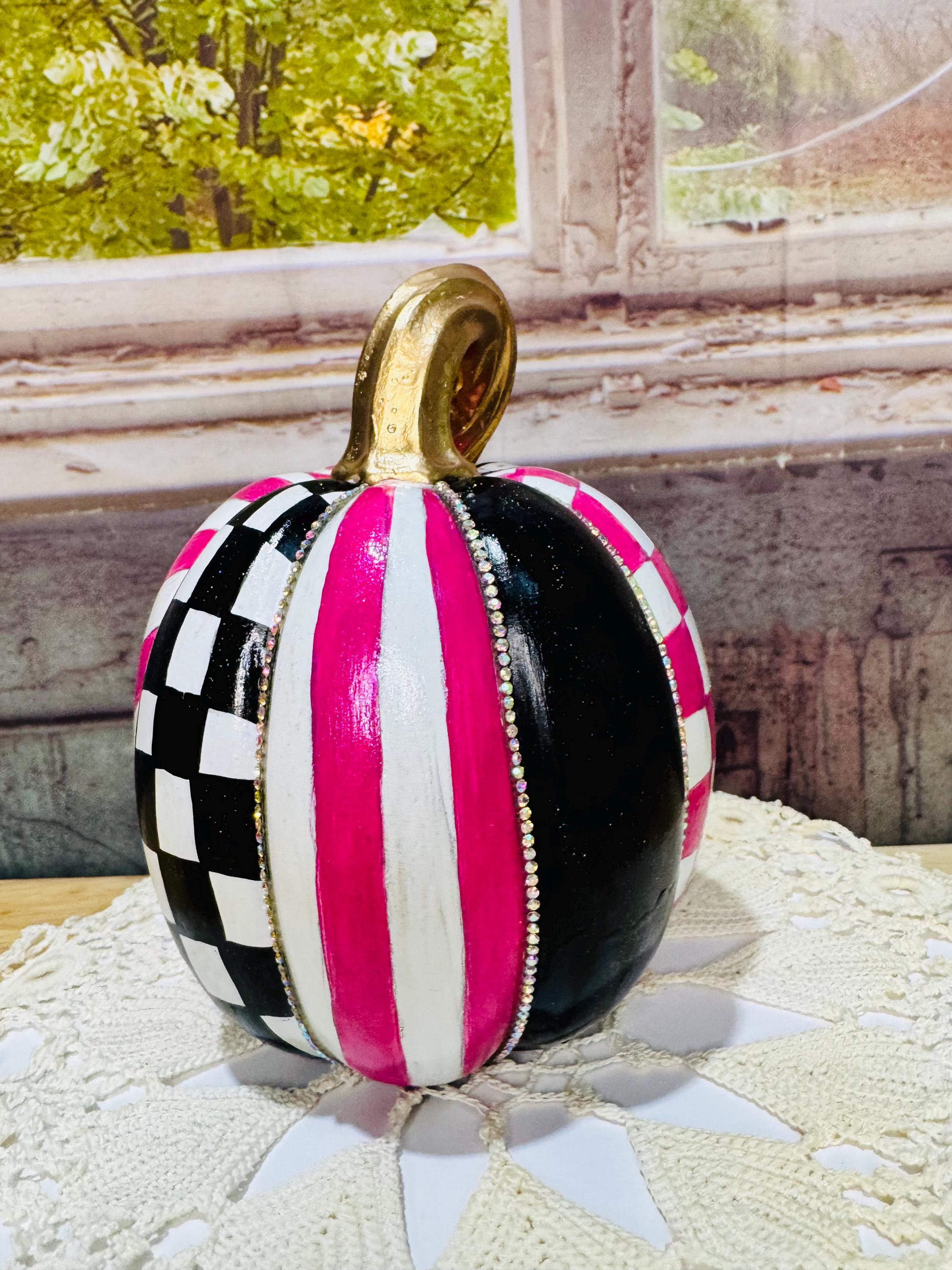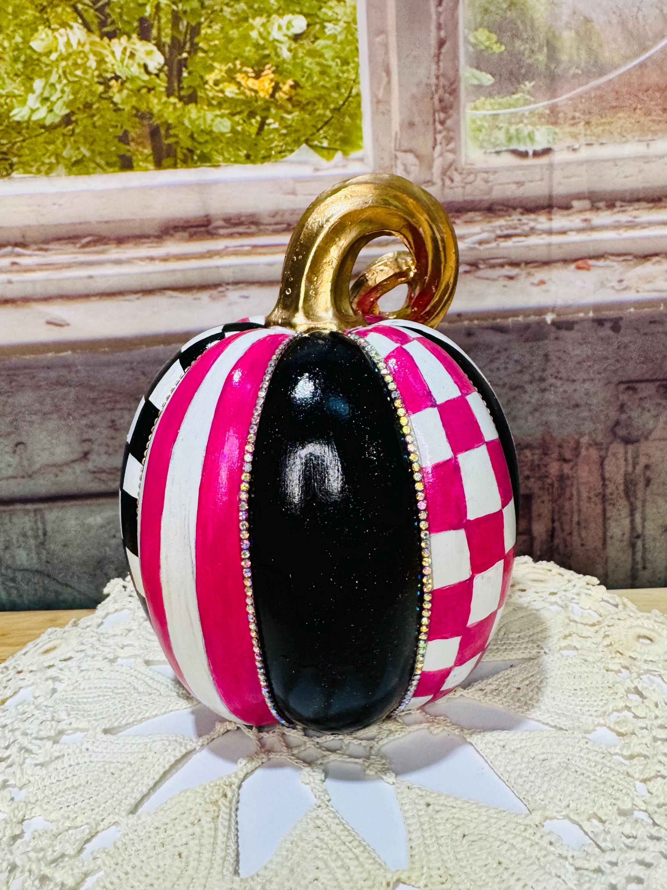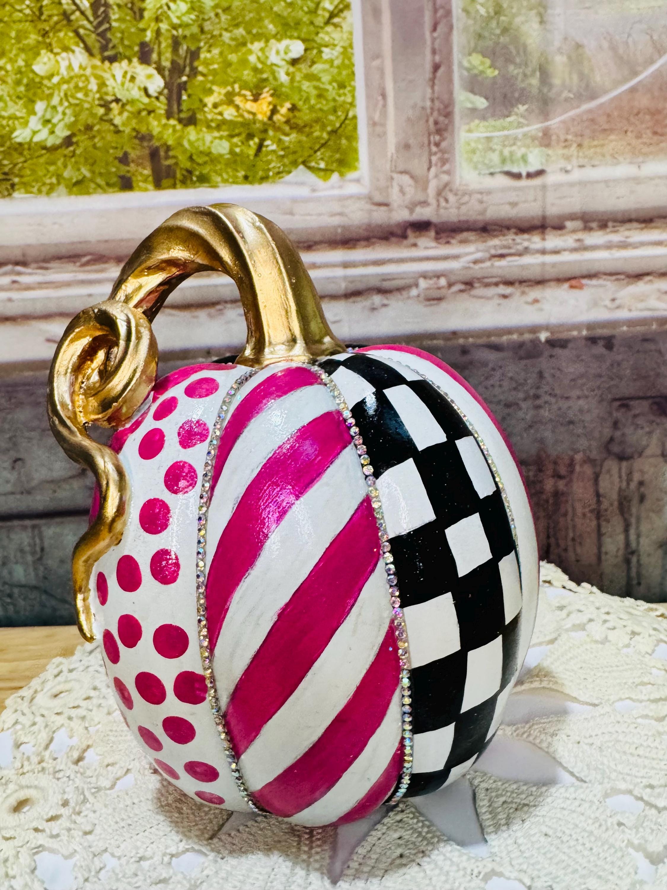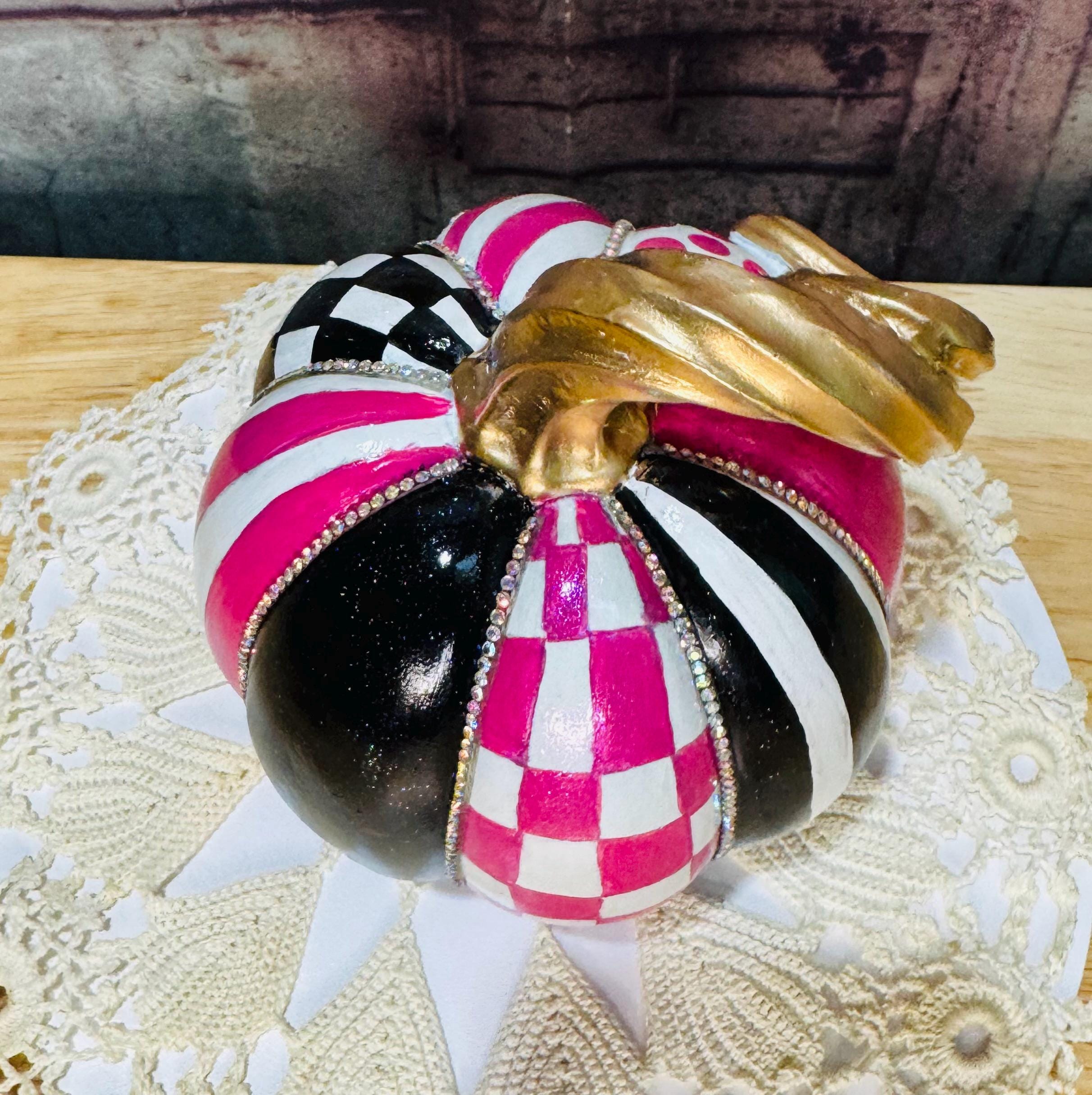Pumpkin decor, hand painted, pumpkin centerpiece, small pumpkin, sparkle trim, black and white and pink pumpkin