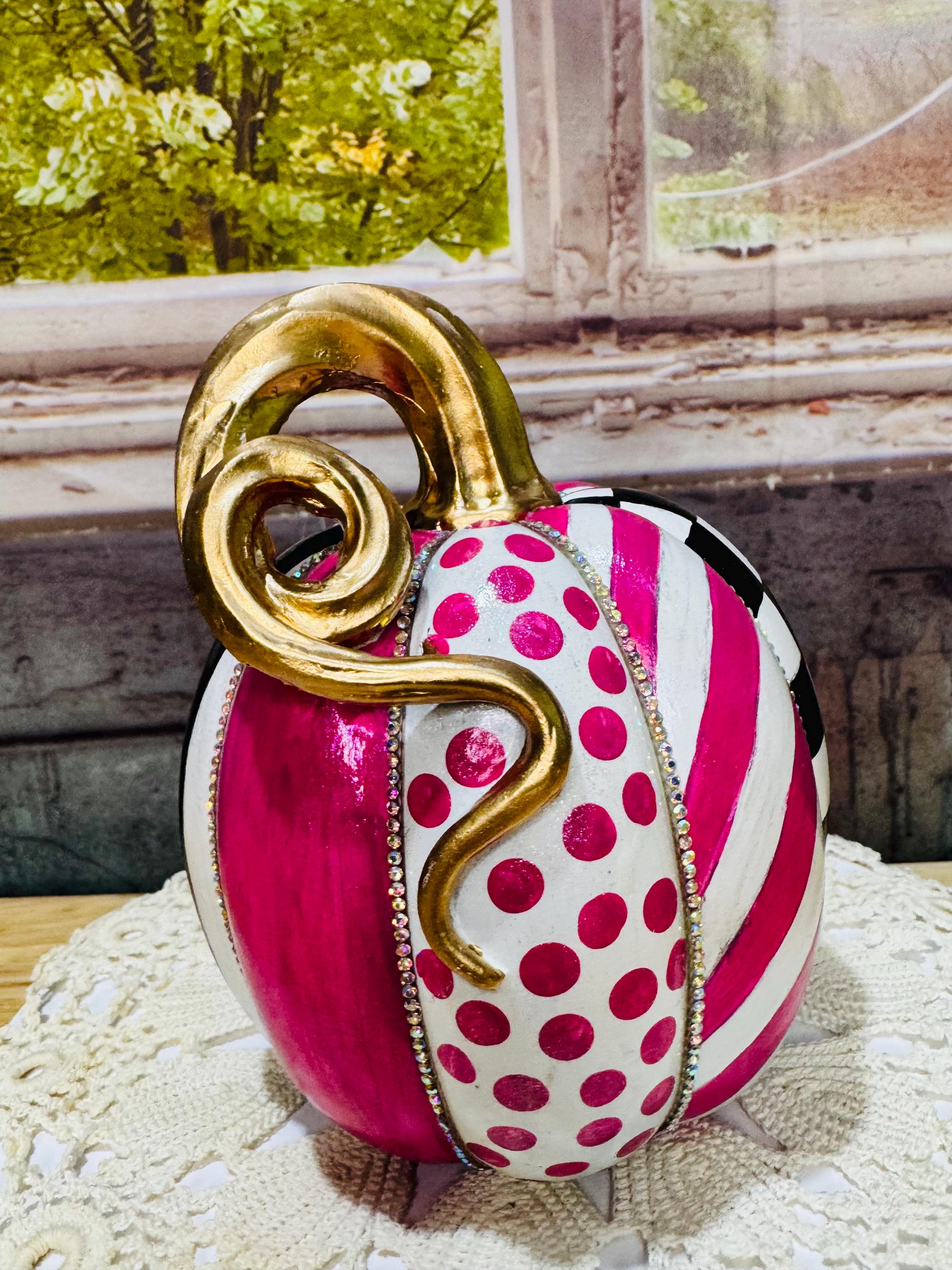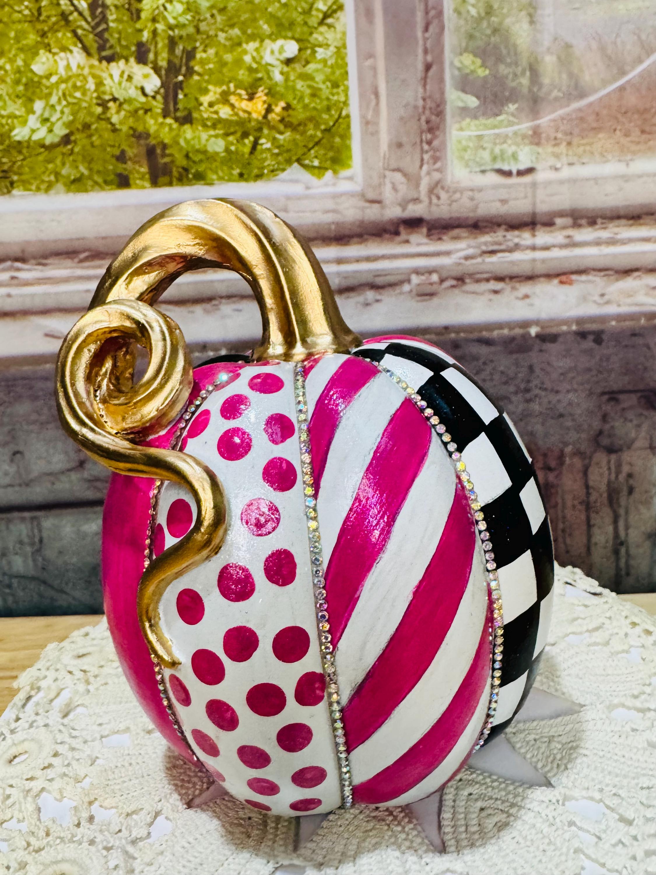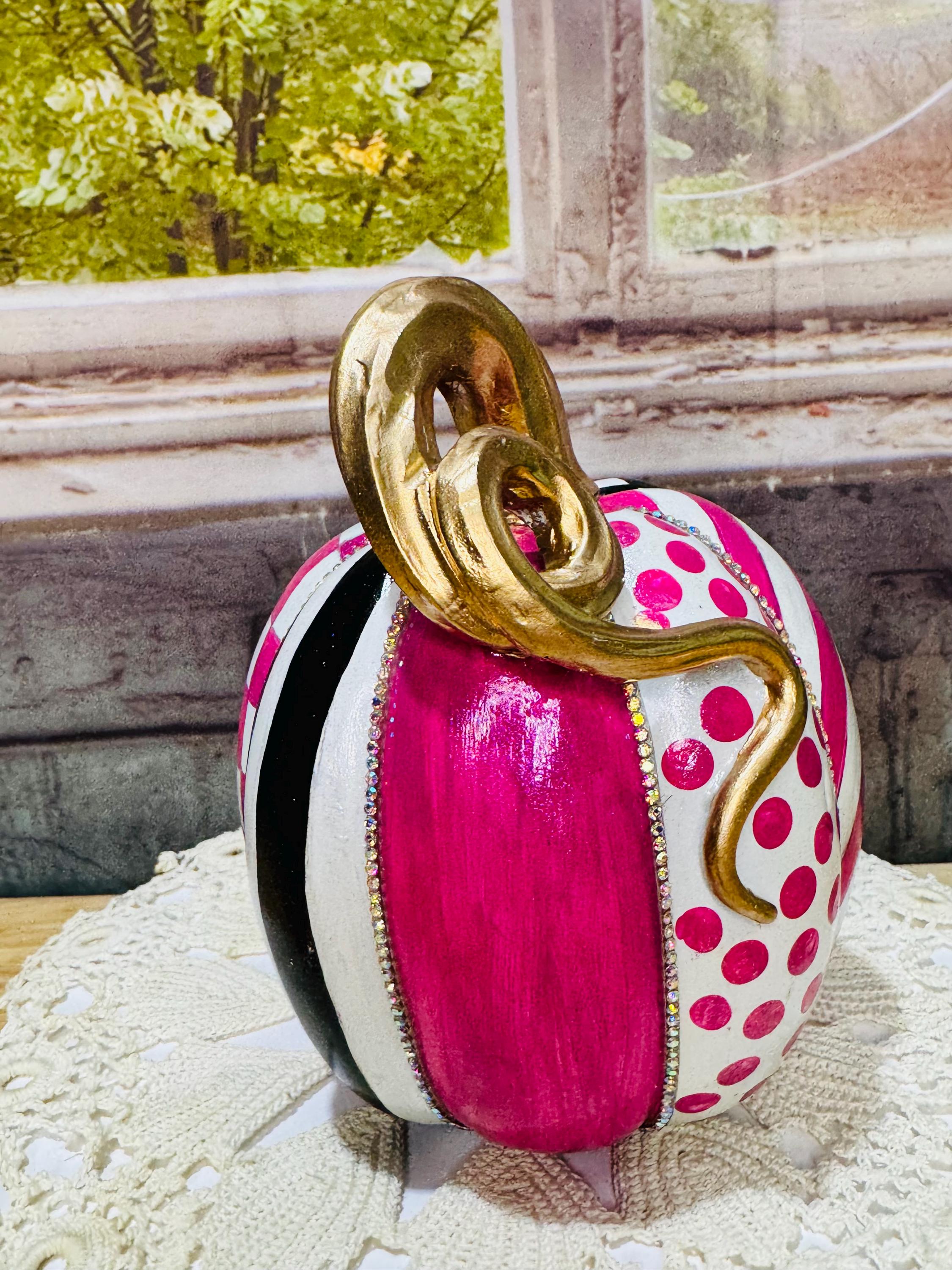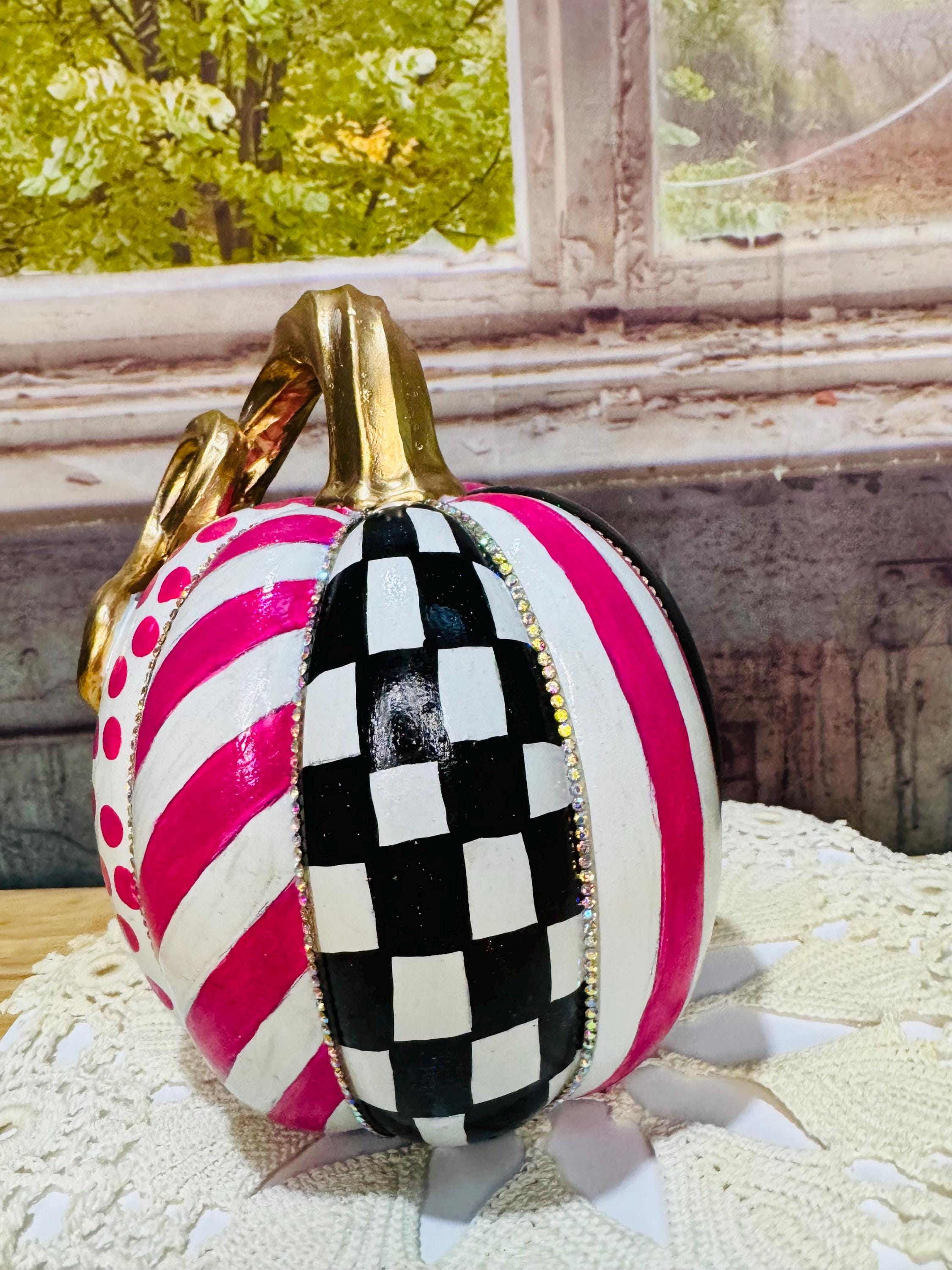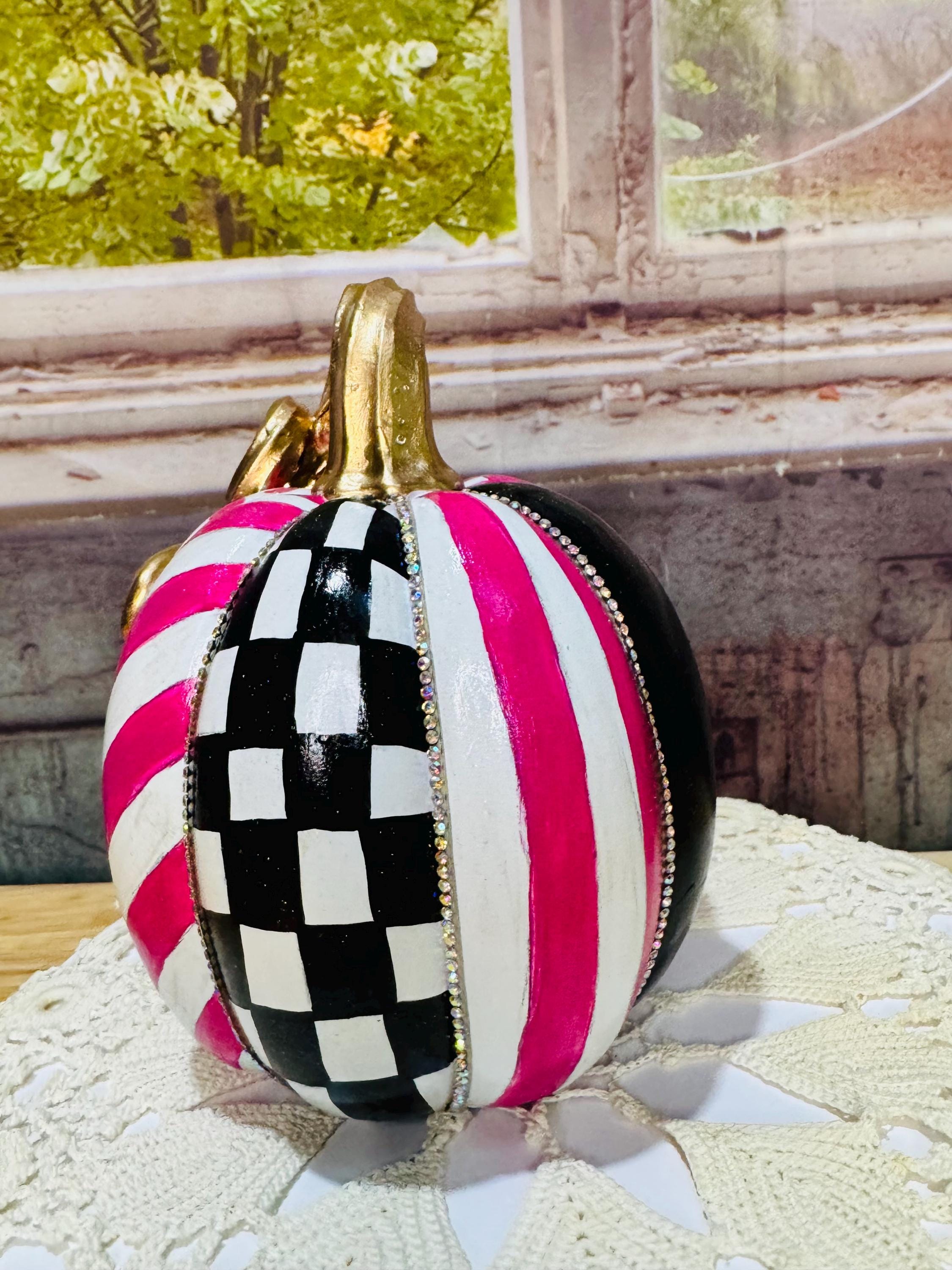 Pumpkin decor, hand painted, pumpkin centerpiece, small pumpkin, sparkle trim, black and white and pink pumpkin